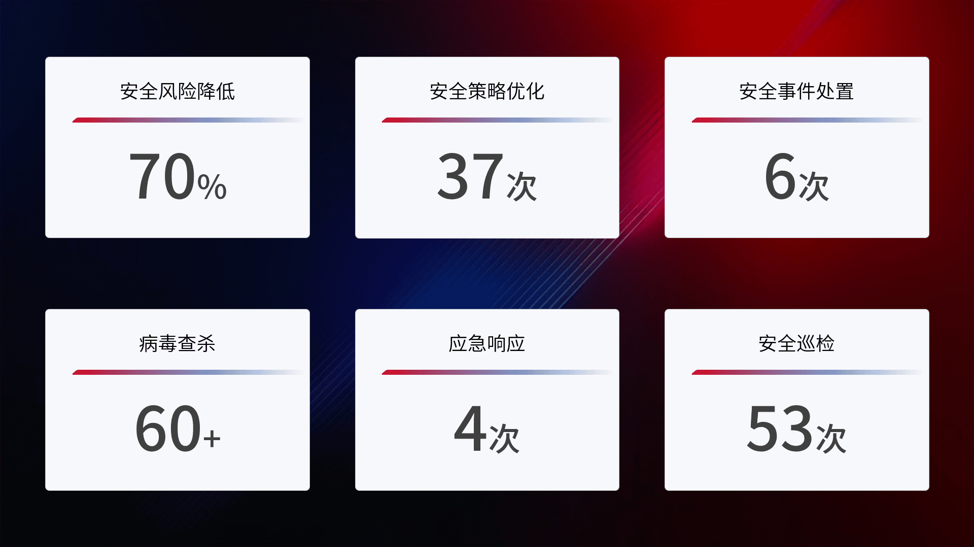 提供全面的安全事件报告体系,,,包括处置报告、、周报、、、、季度和年度总结,,结合持续监控,,帮助客户深入了解网络安全状况。。。